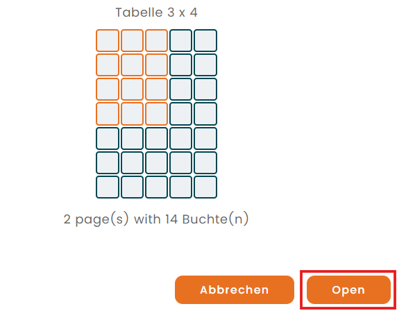 - Wählen Sie, wie viele QR-Codes pro Seite gedruckt werden sollen (hier: 3x4 QR-Codes pro Seite). Drücken Sie anschließend auf "Öffnen".