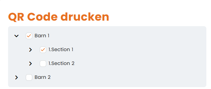 - Markieren Sie die Standorte, für die Sie die QR-Codes benötigen. In diesem Fall ist es Barn 1 und Section 1