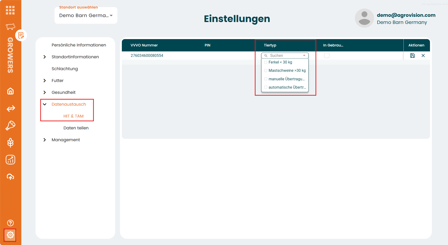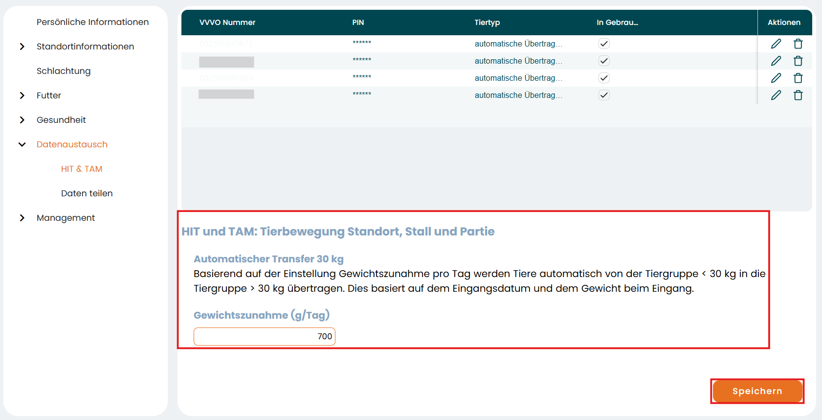 Geben Sie Ihre VVVO Nummer und Pin ein, wählen Sie einen Tiertyp aus und setzen den Haken bei "In Gebrauch". Zum Speichern, klicken Sie das Symbol am Ende der Zeile.