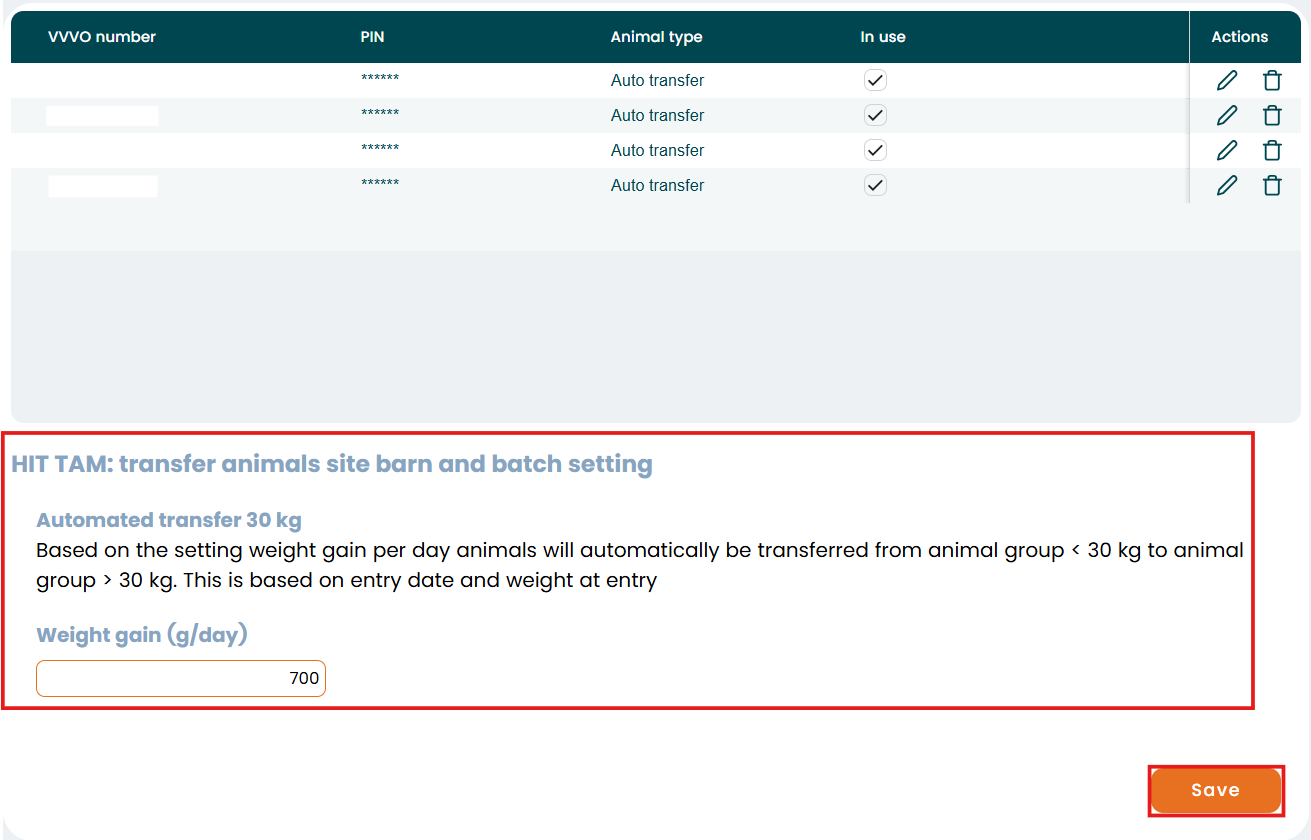 "Auto transfer" -> the program will automatically change the animal type based on the weight gain from Weaners to Finishers. Please note: That this only suitable for a all in / all out production. To use the automatic transfer between both pig types activate the function "Automated transfer 30 kg" and select a weight gain (g/day).